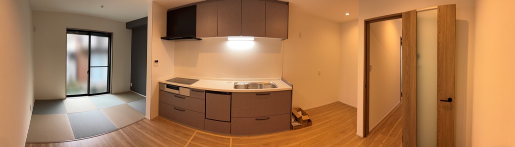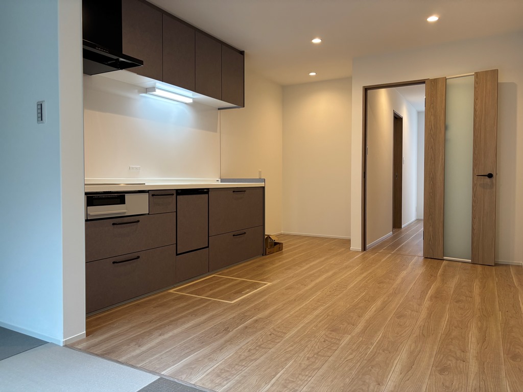 1Fリビング、右側にキッチン、掃出窓の手前がタタミコーナーになります