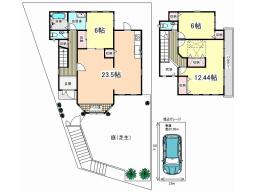 1階68.73平米 2階43.88平米、附属建物:車庫・鉄筋コンクリート造平屋建18.27平米、駐車1台可:堀込ガレージ高さ1.95m・幅2.5m・奥行き5.8m/電動シャッター、天井収納庫約3帖有、南東角地・南向き、近鉄京都線久津川駅徒歩約19分、京都京阪バス大谷停徒歩約4分